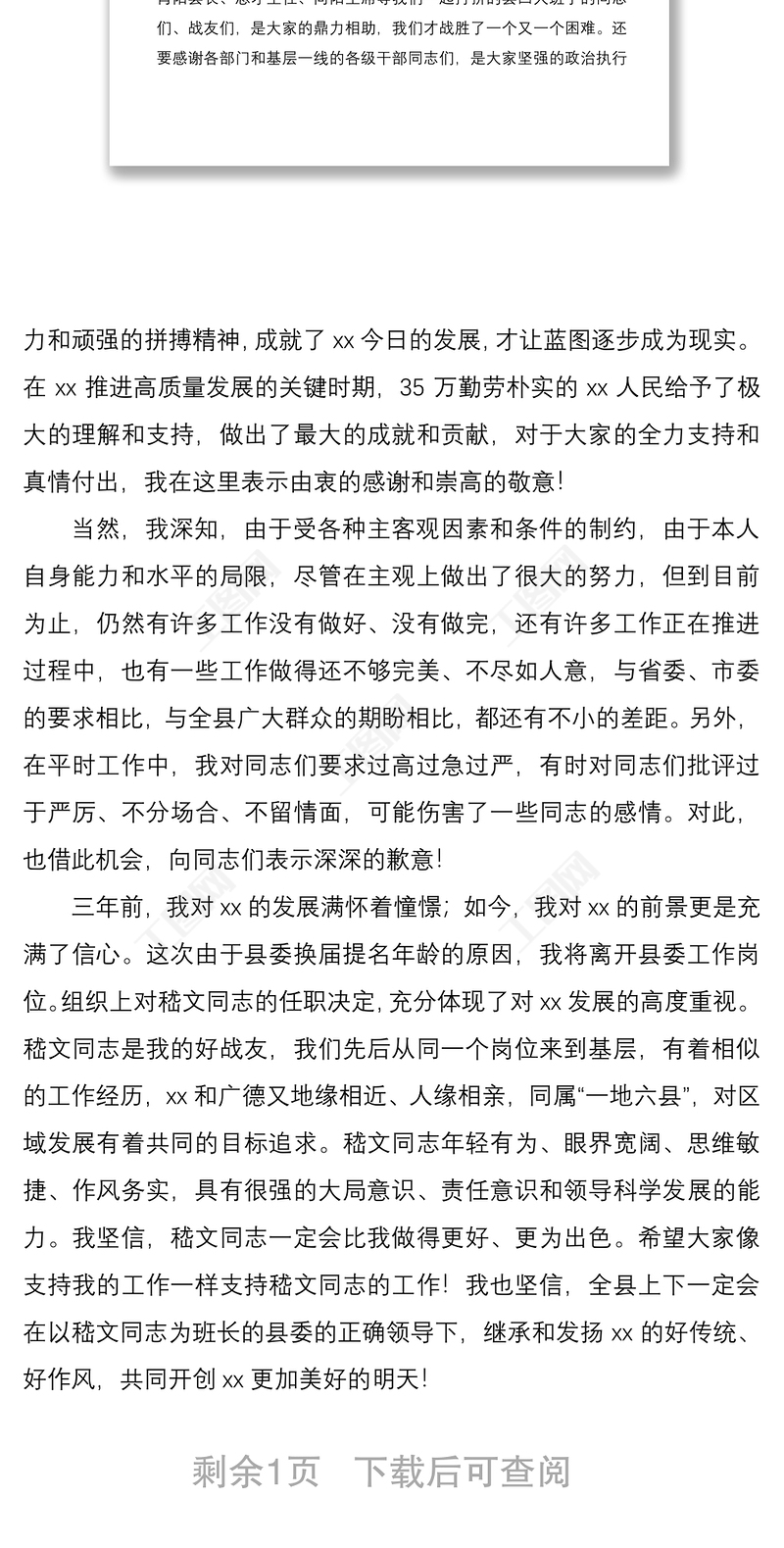 > 領(lǐng)導(dǎo)講話 > 2021【離任感言】在全縣領(lǐng)導(dǎo)干部大會(huì)上的告別講話離任感言.DOCX 【圖片、文字、動(dòng)畫(huà)均可編輯】