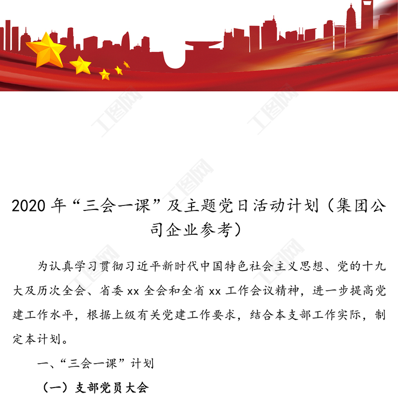 工圖網(wǎng)提供2020年“三會一課”及主題黨日活動計劃(集團公司企業(yè)參考)供會員免費下載。更多精彩黨課PPT素材,盡在工圖網(wǎng)。