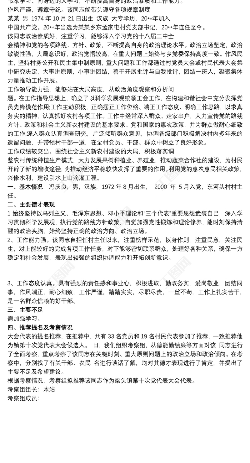 工圖網(wǎng)提供村支部書記委員候選人現(xiàn)實表現(xiàn)考察材料供會員免費(fèi)下載。更多精彩黨課PPT素材,盡在工圖網(wǎng)。