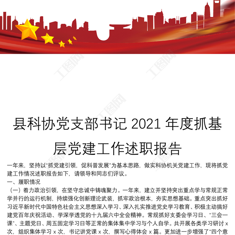 工圖網(wǎng)提供縣科協(xié)黨支部書記2021年度抓基層黨建工作述職報(bào)告供會(huì)員免費(fèi)下載。更多精彩黨課PPT素材,盡在工圖網(wǎng)。