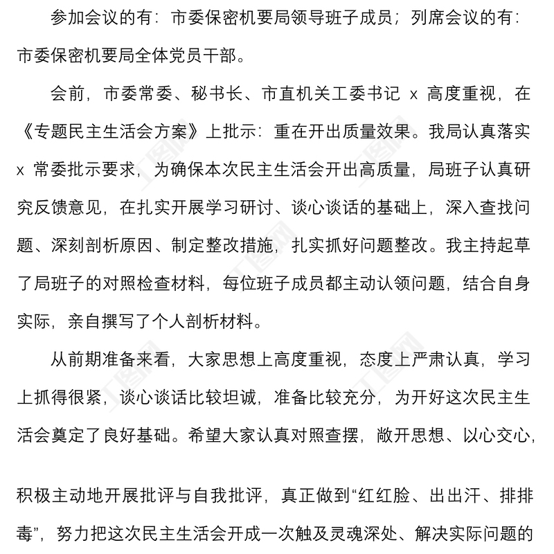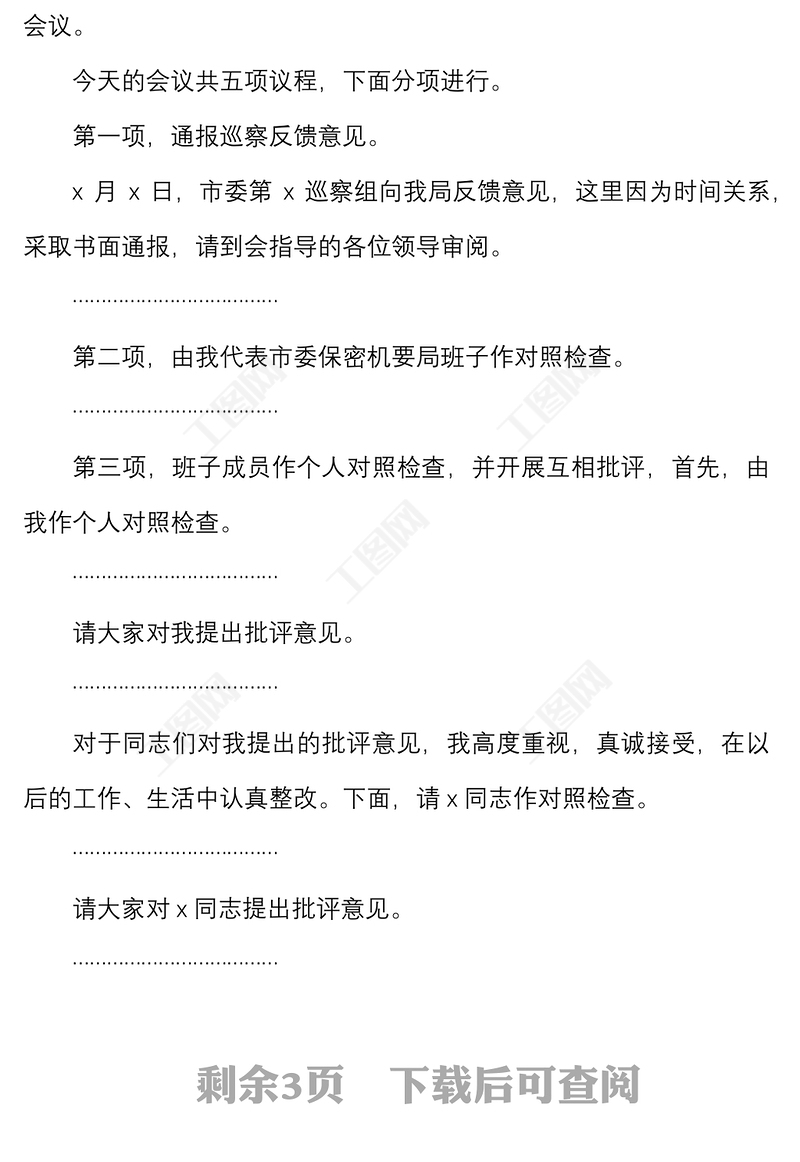 工圖網(wǎng)提供生活會(huì)主持詞保密機(jī)要局巡察整改專題民主生活會(huì)主持詞范文總結(jié)講話供會(huì)員免費(fèi)下載。更多精彩黨課PPT素材,盡在工圖網(wǎng)。