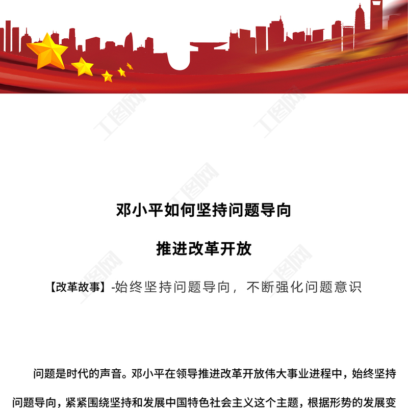 工圖網(wǎng)提供鄧小平如何堅(jiān)持問(wèn)題導(dǎo)向推進(jìn)改革開(kāi)放PPT簡(jiǎn)潔大氣改革故事課件(講稿)供會(huì)員免費(fèi)下載。更多精彩黨課PPT素材,盡在工圖網(wǎng)。