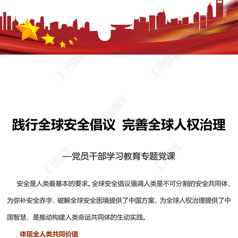 工圖網(wǎng)提供2023踐行全球安全倡議完善全球人權(quán)治理PPT大氣精美風(fēng)黨員干部學(xué)習(xí)教育專題黨課課件(講稿)供會員免費下載。更多精彩黨課PPT素材,盡在工圖網(wǎng)。