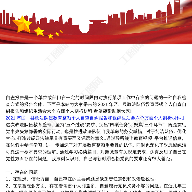 工圖網(wǎng)提供2021年區(qū)、縣政法隊伍教育整頓個人自查自糾報告和組織生活會六個方面?zhèn)€人剖析材料三篇供會員免費下載。更多精彩黨課PPT素材,盡在工圖網(wǎng)。