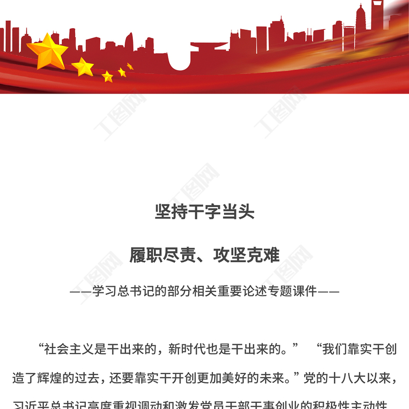 工圖網(wǎng)提供紅色簡潔堅持干字當頭履職盡責攻堅克難PPT學習總書記重要論述專題課件(講稿)供會員免費下載。更多精彩黨課PPT素材,盡在工圖網(wǎng)。