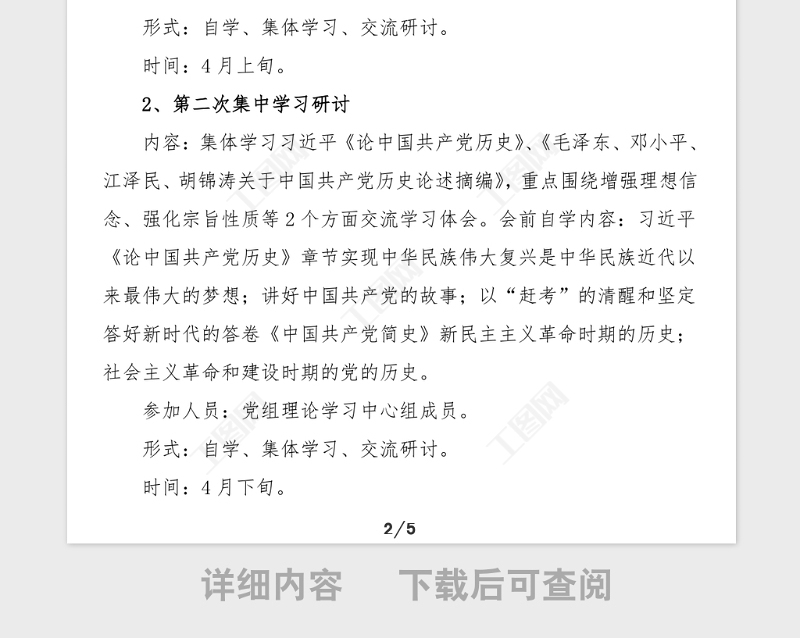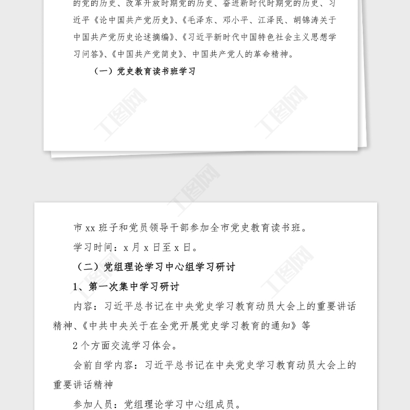 工圖網(wǎng)提供黨史學(xué)習(xí)教育讀書班學(xué)習(xí)計(jì)劃范文工作方案供會(huì)員免費(fèi)下載。更多精彩黨課PPT素材,盡在工圖網(wǎng)。
