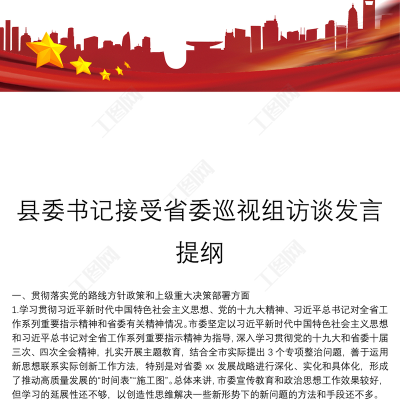 工圖網(wǎng)提供縣委書(shū)記接受省委巡視組訪談發(fā)言提綱供會(huì)員免費(fèi)下載。更多精彩黨課PPT素材,盡在工圖網(wǎng)。