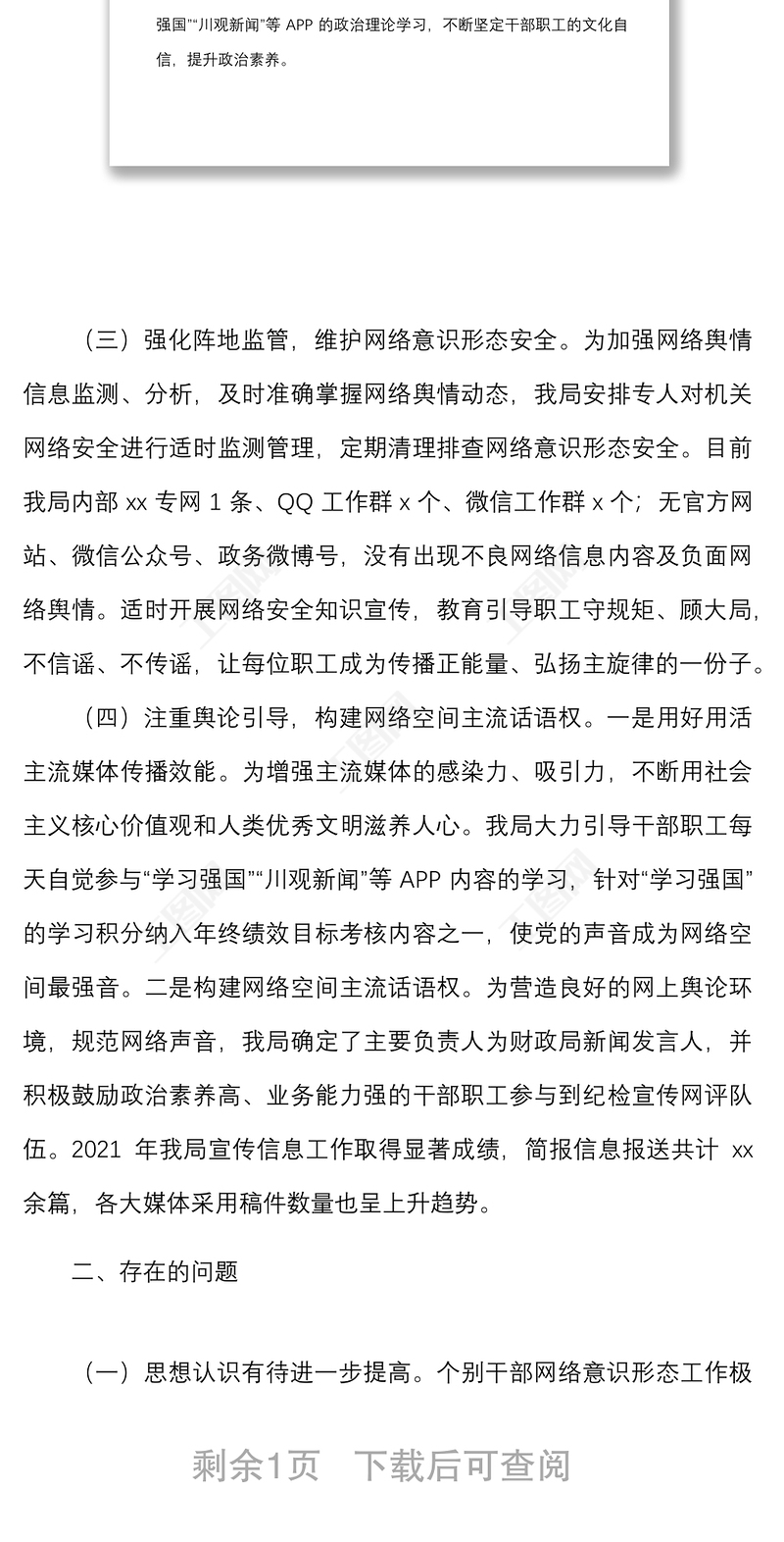 2021年意識(shí)形態(tài)工作學(xué)習(xí)材料2021黨支部書記意識(shí)形態(tài)工作述職報(bào)告2022黨員領(lǐng)導(dǎo)干部網(wǎng)絡(luò)意識(shí)形態(tài)工作教育培訓(xùn)工作方案2021黨委黨組網(wǎng)絡(luò)意識(shí)形態(tài)工作責(zé)任實(shí)施細(xì)則全文專題研究意識(shí)形態(tài)工作會(huì)議記錄2021意識(shí)形態(tài)工作組織生活會(huì)材料2021網(wǎng)絡(luò)意識(shí)形態(tài)工作分析研判報(bào)告2022意識(shí)形態(tài)工作巡察重點(diǎn)及注意事項(xiàng)統(tǒng)戰(zhàn)部工作意識(shí)形態(tài)發(fā)言中學(xué)2021年意識(shí)形態(tài)工作總結(jié)退役軍人事務(wù)局2022年意識(shí)形態(tài)工作計(jì)劃2022公安局意識(shí)形態(tài)工作講話稿2021意識(shí)形態(tài)網(wǎng)絡(luò)輿情管控工作總結(jié)編辦意識(shí)形態(tài)工作整改2022網(wǎng)絡(luò)意識(shí)形態(tài)工作培訓(xùn)資料