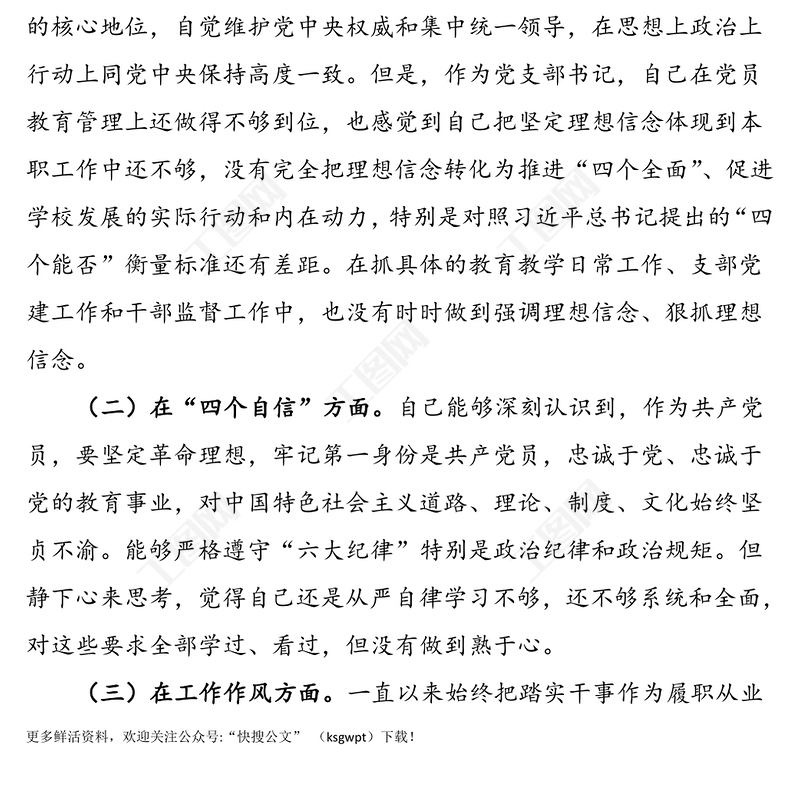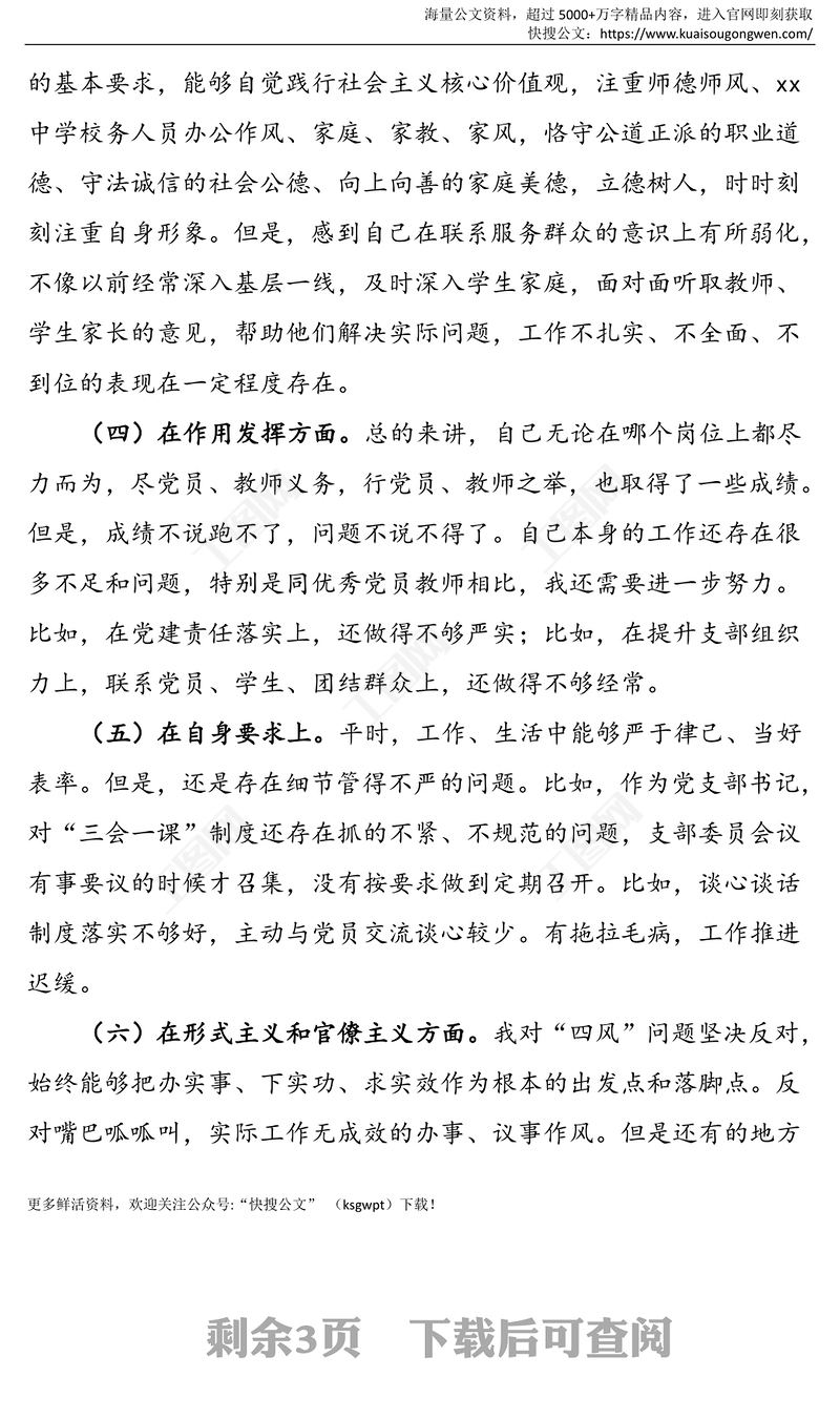 個(gè)人對照檢查學(xué)校黨支部書記組織生活會(huì)個(gè)人對照檢查材料范文學(xué)校教師個(gè)人檢視剖析材料四個(gè)意識四個(gè)自信工作作風(fēng)形式主義官僚主義等方面