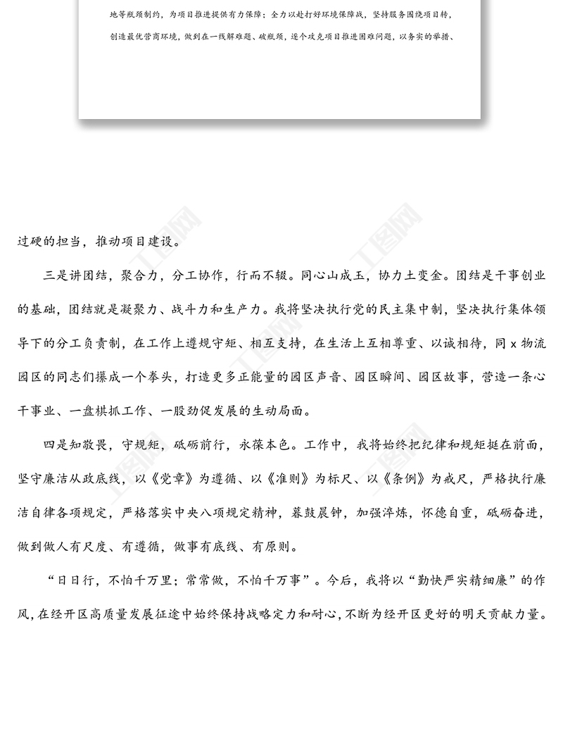 工圖網提供經開區(qū)園區(qū)管委會副主任在干部職工大會上的表態(tài)發(fā)言材料供會員免費下載。更多精彩黨課PPT素材,盡在工圖網。