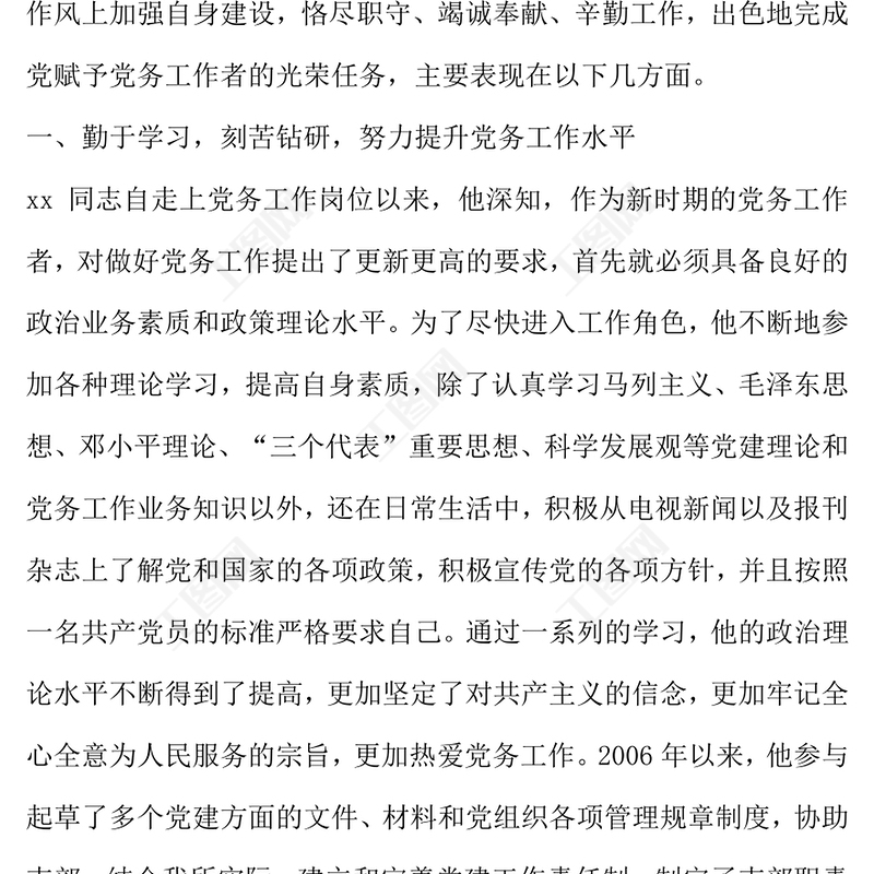 工圖網(wǎng)提供2021年優(yōu)秀黨務(wù)工作者個人先進(jìn)事跡材料范文供會員免費下載。更多精彩黨課PPT素材,盡在工圖網(wǎng)。