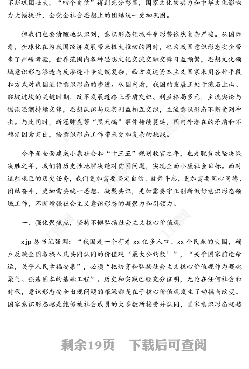 2021年意識(shí)形態(tài)工作學(xué)習(xí)材料2021黨支部書(shū)記意識(shí)形態(tài)工作述職報(bào)告2022黨員領(lǐng)導(dǎo)干部網(wǎng)絡(luò)意識(shí)形態(tài)工作教育培訓(xùn)工作方案2021黨委黨組網(wǎng)絡(luò)意識(shí)形態(tài)工作責(zé)任實(shí)施細(xì)則全文專(zhuān)題研究意識(shí)形態(tài)工作會(huì)議記錄2021意識(shí)形態(tài)工作組織生活會(huì)材料2021網(wǎng)絡(luò)意識(shí)形態(tài)工作分析研判報(bào)告2022年意識(shí)形態(tài)個(gè)人研討發(fā)言材料2022意識(shí)形態(tài)工作巡察重點(diǎn)及注意事項(xiàng)公安意識(shí)形態(tài)工作計(jì)劃2021統(tǒng)戰(zhàn)部工作意識(shí)形態(tài)發(fā)言中學(xué)2021年意識(shí)形態(tài)工作總結(jié)2022關(guān)于審議意識(shí)形態(tài)工作報(bào)告的請(qǐng)示2021車(chē)隊(duì)意識(shí)形態(tài)工作總結(jié)編辦意識(shí)形態(tài)工作整改社區(qū)2021年上半年意識(shí)形態(tài)工作總結(jié)