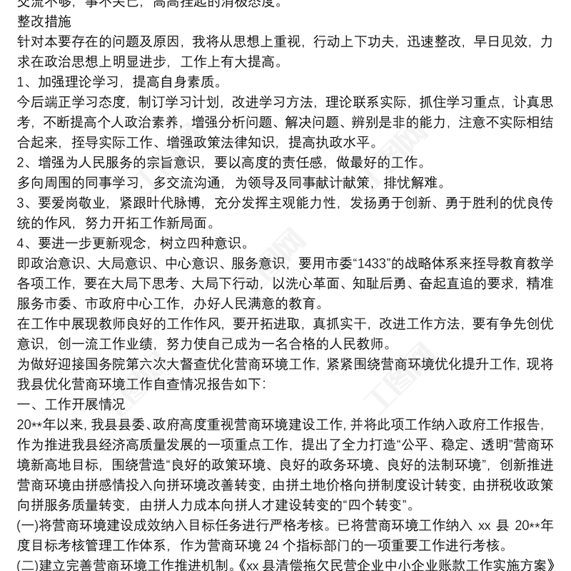 工圖網(wǎng)提供優(yōu)化營商環(huán)境個(gè)人剖析材料3篇供會(huì)員免費(fèi)下載。更多精彩黨課PPT素材,盡在工圖網(wǎng)。