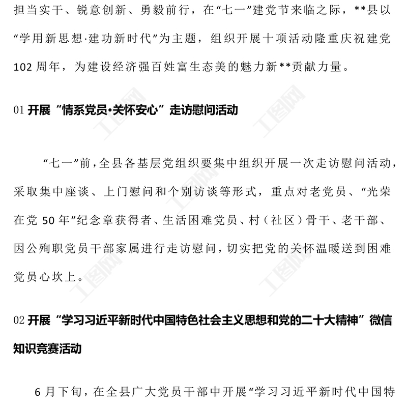 工圖網(wǎng)提供2023學(xué)用新思想建功新時代PPT市縣開展十項活動隆重慶祝建黨102周年(講稿)供會員免費下載。更多精彩黨課PPT素材,盡在工圖網(wǎng)。