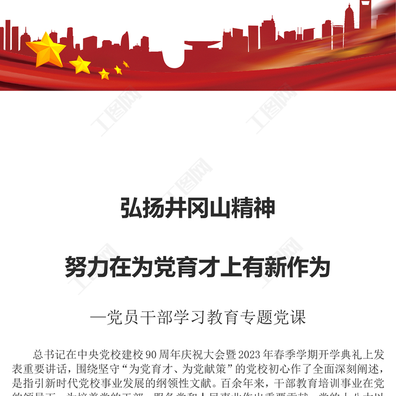 > 黨課講稿 > 2023弘揚(yáng)井岡山精神努力在為黨育才上有新作為PPT大氣精美風(fēng)黨員干部學(xué)習(xí)教育專題黨課課件(講稿).DOCX 【圖片、文字、動(dòng)畫均可編輯】