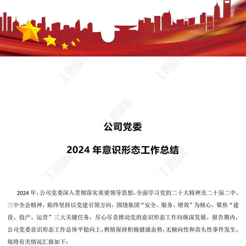 工圖網(wǎng)提供公司黨委2024年意識形態(tài)工作總結(jié)PPT模板(講稿)供會員免費下載。更多精彩黨課PPT素材,盡在工圖網(wǎng)。