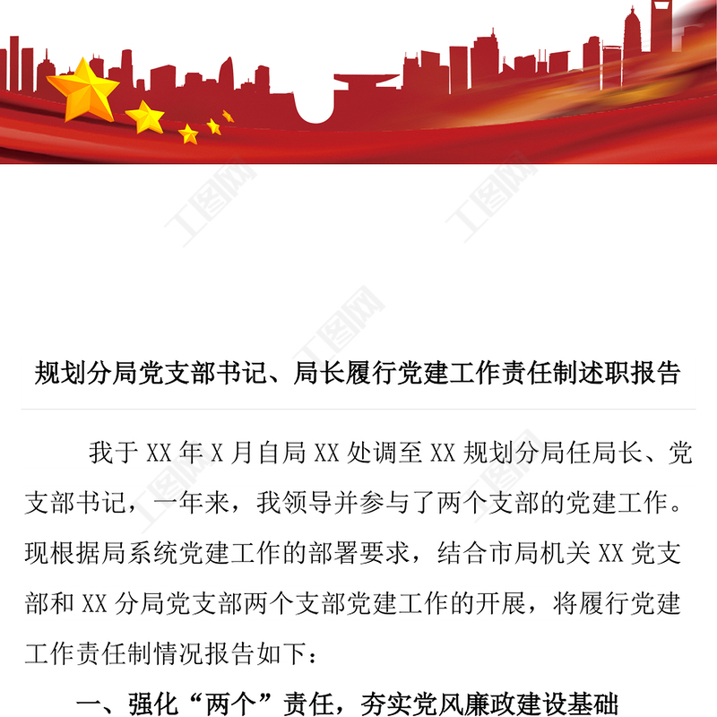 工圖網(wǎng)提供規(guī)劃分局黨支部書(shū)記局長(zhǎng)履行黨建工作責(zé)任制述職報(bào)告供會(huì)員免費(fèi)下載。更多精彩黨課PPT素材,盡在工圖網(wǎng)。