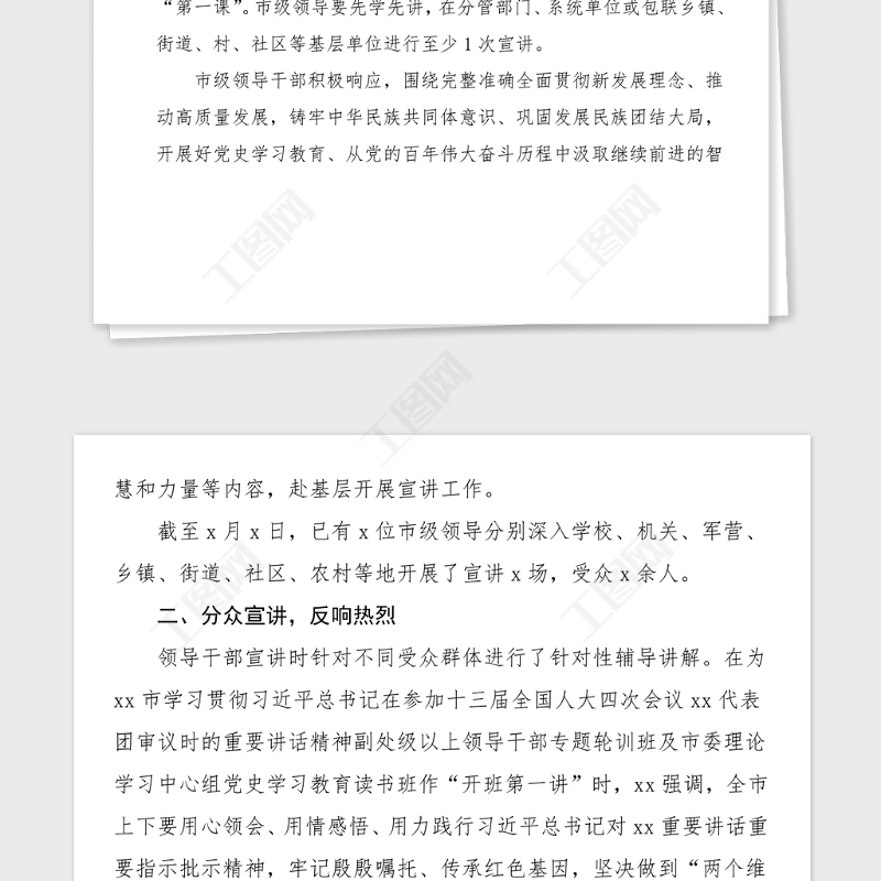 工圖網(wǎng)提供市級(jí)領(lǐng)導(dǎo)干部帶頭宣講黨史學(xué)習(xí)教育第一課情況總結(jié)范文工作總結(jié)匯報(bào)報(bào)告供會(huì)員免費(fèi)下載。更多精彩黨課PPT素材,盡在工圖網(wǎng)。