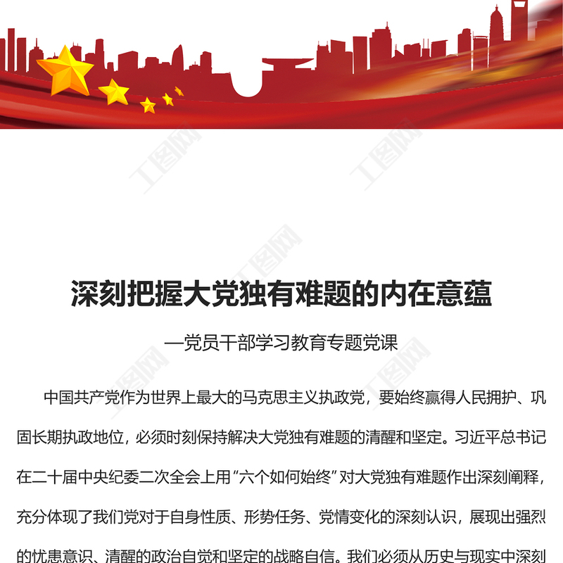 工圖網(wǎng)提供2023深刻把握大黨獨(dú)有難題的內(nèi)在意蘊(yùn)PPT大氣精美風(fēng)黨員干部學(xué)習(xí)教育專題黨課(講稿)供會(huì)員免費(fèi)下載。更多精彩黨課PPT素材,盡在工圖網(wǎng)。