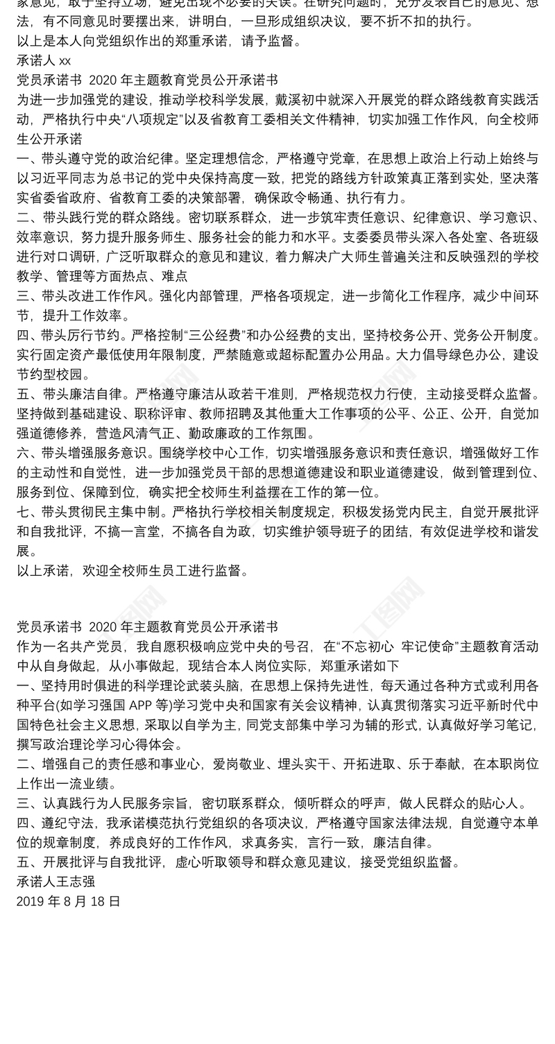 黨員承諾書 2020年主題教育黨員公開承諾書