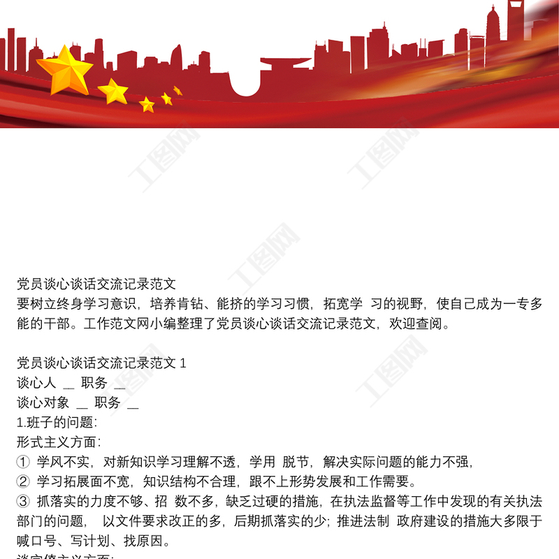 工圖網(wǎng)提供黨員談心談話交流記錄范文供會(huì)員免費(fèi)下載。更多精彩黨課PPT素材,盡在工圖網(wǎng)。