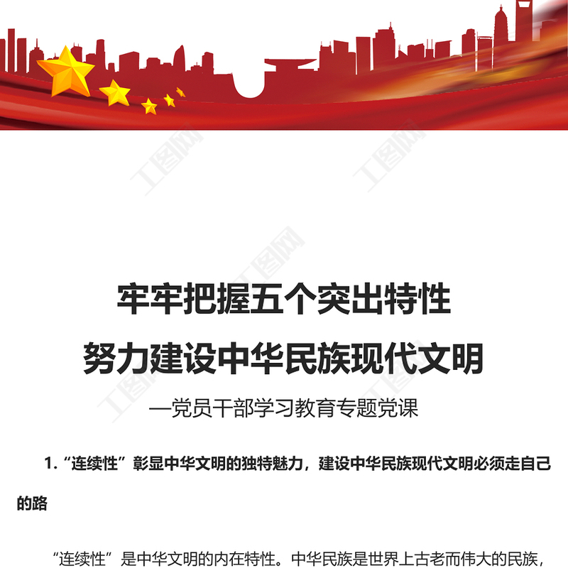 工圖網(wǎng)提供2023牢牢把握五個(gè)突出特性努力建設(shè)中華民族現(xiàn)代文明PPT大氣精美風(fēng)黨員干部學(xué)習(xí)教育專題黨課課件(講稿)供會(huì)員免費(fèi)下載。更多精彩黨課PPT素材,盡在工圖網(wǎng)。