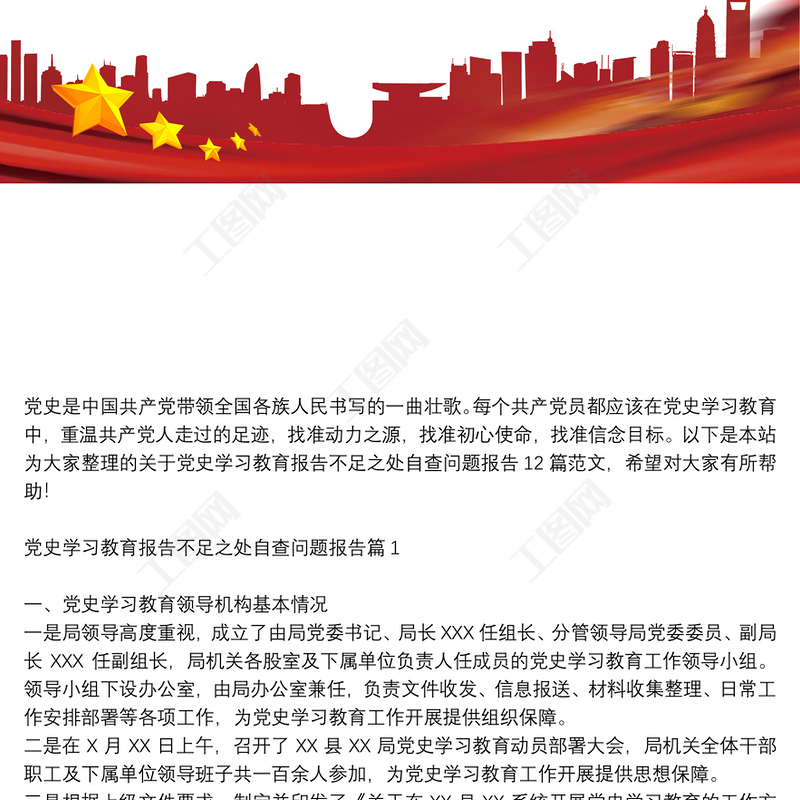 工圖網(wǎng)提供黨史學(xué)習(xí)教育報告不足之處自查問題報告12篇供會員免費下載。更多精彩黨課PPT素材,盡在工圖網(wǎng)。
