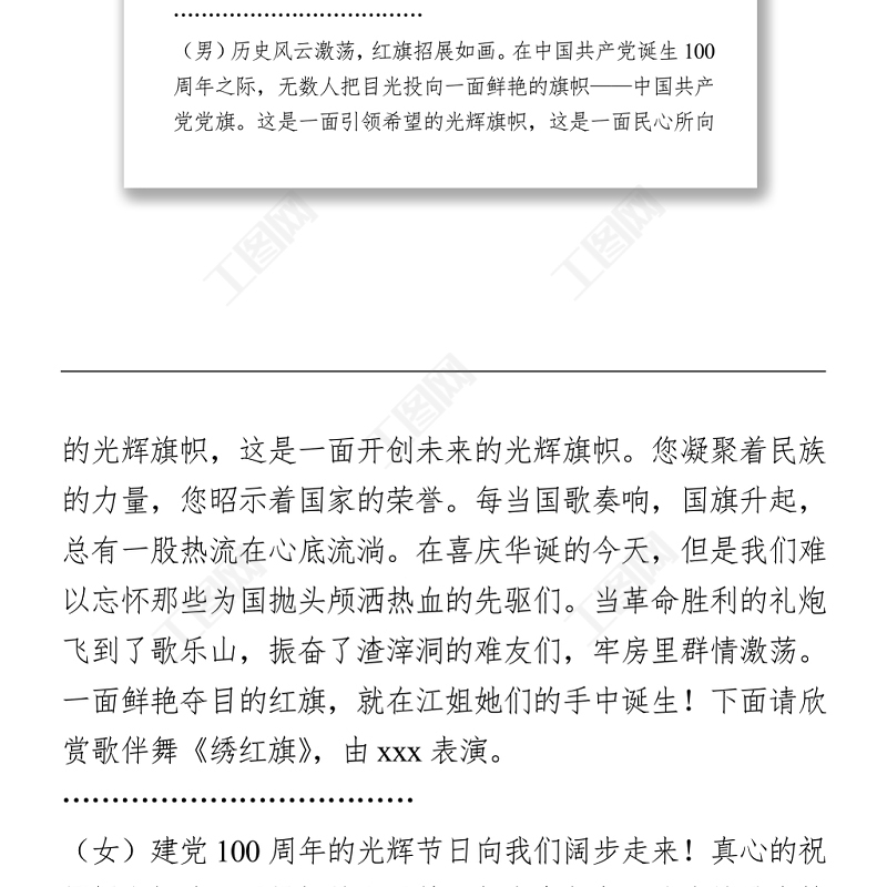 工圖網(wǎng)提供2021慶祝建黨100周年文藝聯(lián)歡會主持人串詞范文供會員免費(fèi)下載。更多精彩黨課PPT素材,盡在工圖網(wǎng)。