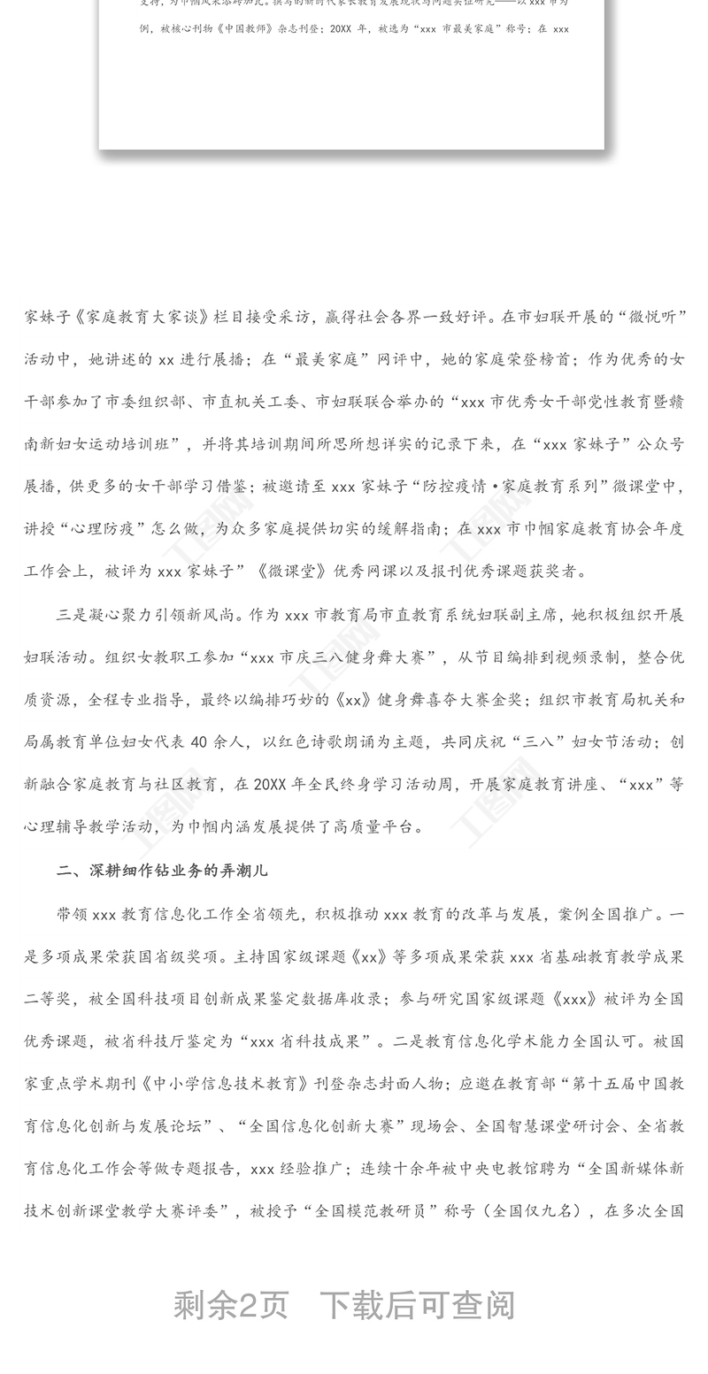 工圖網(wǎng)提供教師申報省三八紅旗手事跡材料供會員免費下載。更多精彩黨課PPT素材,盡在工圖網(wǎng)。
