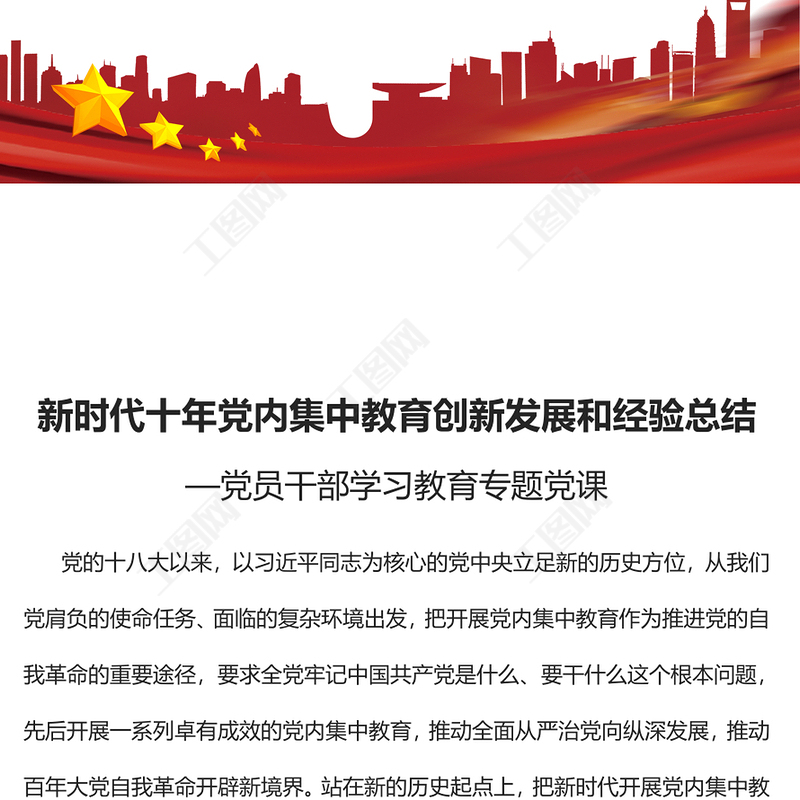 工圖網(wǎng)提供2023新時代十年黨內(nèi)集中教育創(chuàng)新發(fā)展和經(jīng)驗總結(jié)PPT大氣精美風(fēng)黨員干部學(xué)習(xí)教育專題黨課課件(講稿)供會員免費下載。更多精彩黨課PPT素材,盡在工圖網(wǎng)。