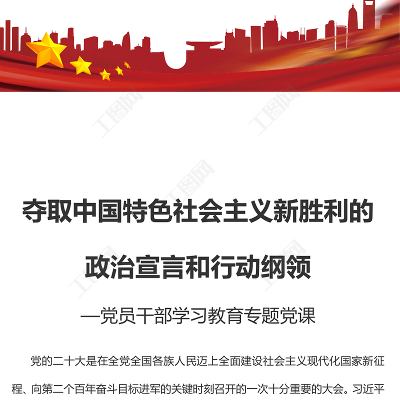 工圖網(wǎng)提供2022奪取中國特色社會主義新勝利的政治宣言和行動綱領(lǐng)PPT大氣黨建風(fēng)黨員干部學(xué)習(xí)教育專題黨課黨建課件(講稿)供會員免費下載。更多精彩黨課PPT素材,盡在工圖網(wǎng)。