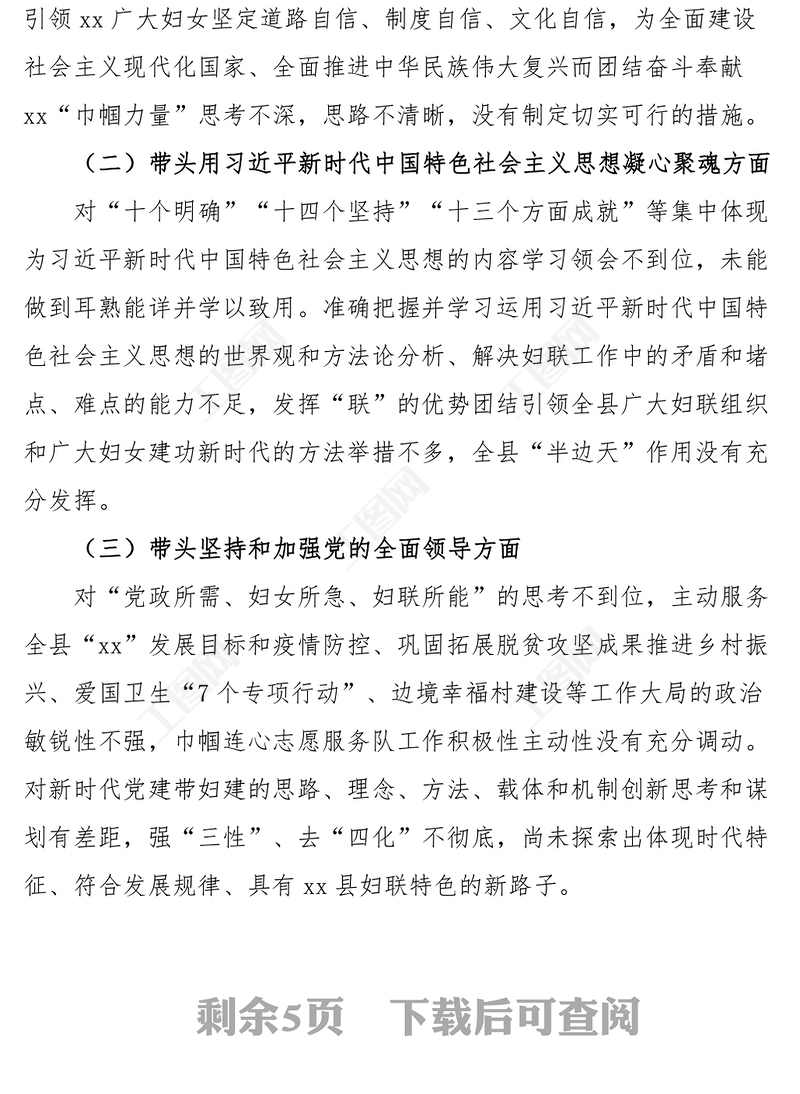> 對(duì)照檢查 > 2023年民主生活會(huì)“六個(gè)帶頭”個(gè)人對(duì)照檢查材料(縣婦聯(lián)主席).DOCX 【圖片、文字、動(dòng)畫(huà)均可編輯】