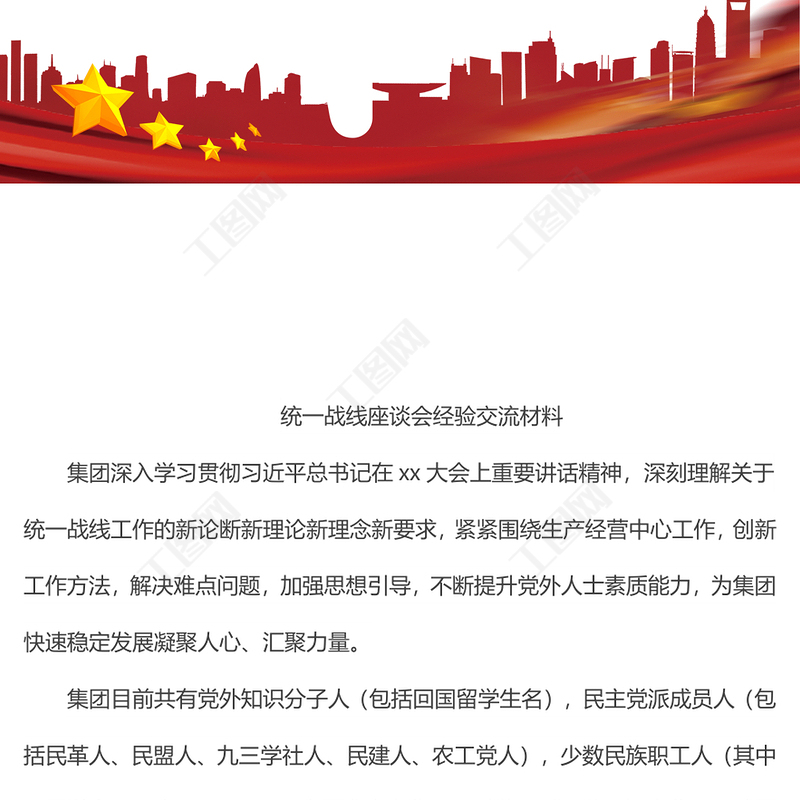 工圖網(wǎng)提供統(tǒng)一戰(zhàn)線座談會經(jīng)驗交流材料供會員免費下載。更多精彩黨課PPT素材,盡在工圖網(wǎng)。