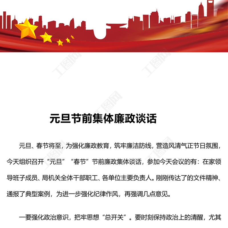 工圖網(wǎng)提供元旦節(jié)前集體廉政談話范文供會員免費(fèi)下載。更多精彩黨課PPT素材,盡在工圖網(wǎng)。