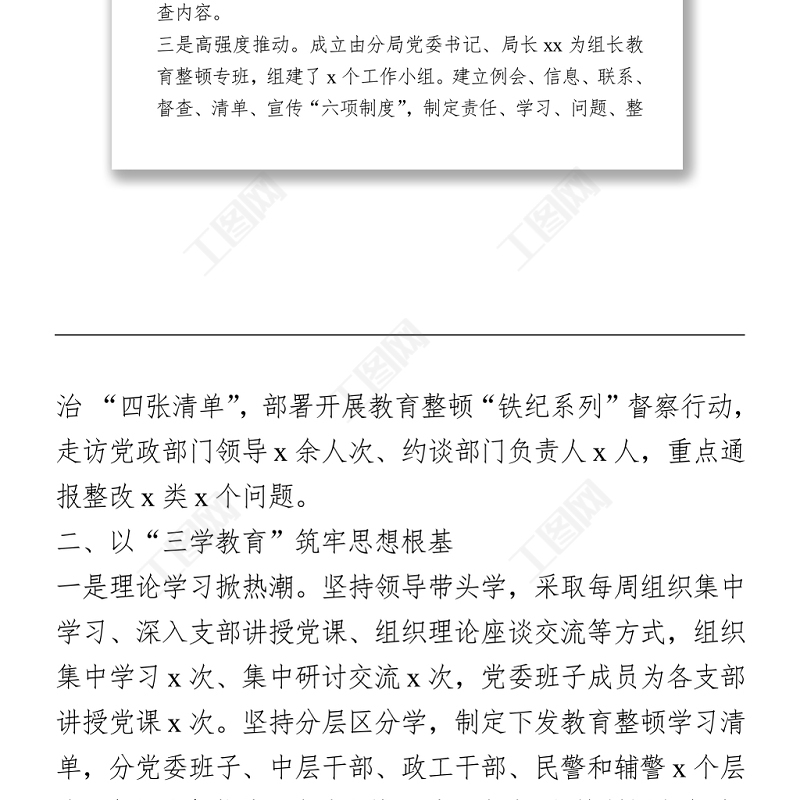 工圖網(wǎng)提供政法隊(duì)伍教育整頓鏟除頑瘴痼疾階段工作匯報(bào)供會(huì)員免費(fèi)下載。更多精彩黨課PPT素材,盡在工圖網(wǎng)。
