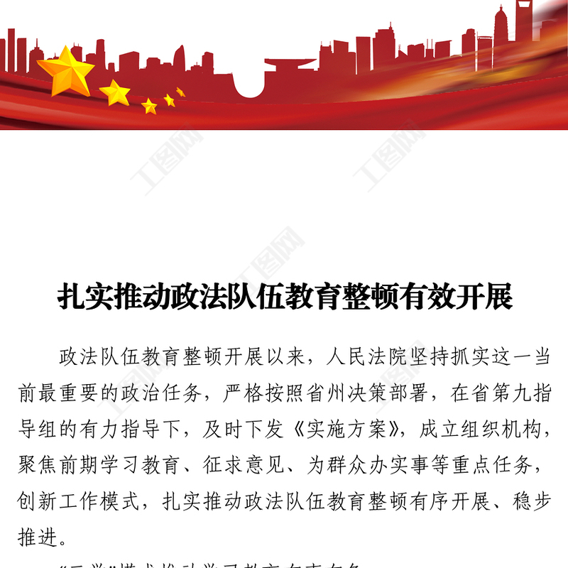 工圖網(wǎng)提供2021法院扎實(shí)推動(dòng)政法隊(duì)伍教育整頓有效開展供會(huì)員免費(fèi)下載。更多精彩黨課PPT素材,盡在工圖網(wǎng)。