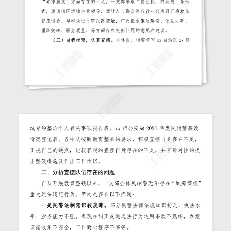工圖網(wǎng)提供頑瘴痼疾自查自糾報(bào)告公安交警大隊(duì)政法隊(duì)伍教育整頓頑瘴痼疾自查自糾活動(dòng)報(bào)告范文公安局交警支隊(duì)大隊(duì)工作總結(jié)匯報(bào)報(bào)告供會(huì)員免費(fèi)下載。更多精彩黨課PPT素材,盡在工圖網(wǎng)。
