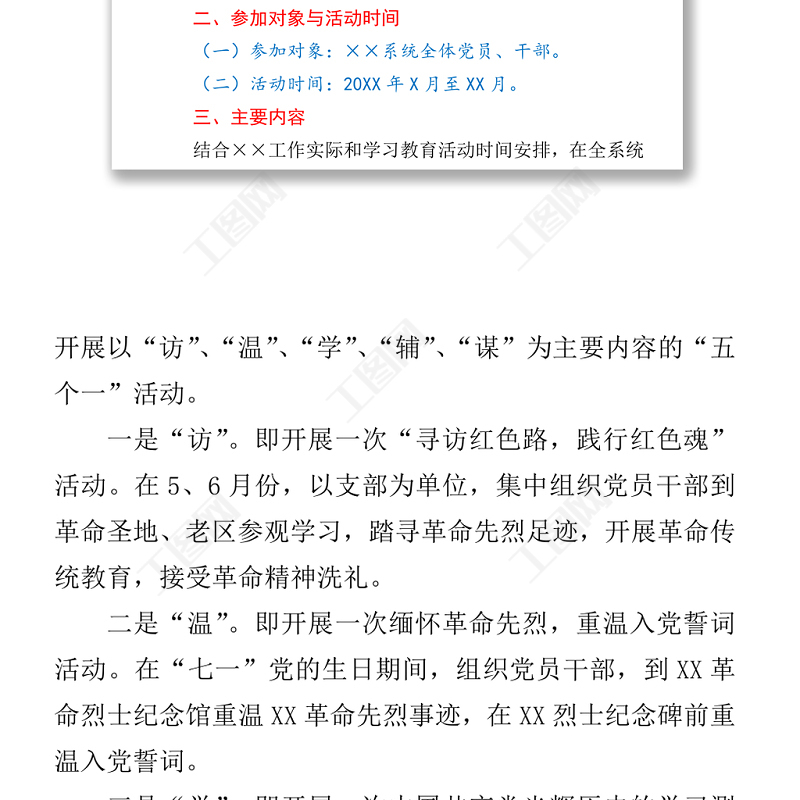 工圖網(wǎng)提供“學(xué)黨史、知黨情、跟黨走”學(xué)習(xí)教育活動方案供會員免費下載。更多精彩黨課PPT素材,盡在工圖網(wǎng)。