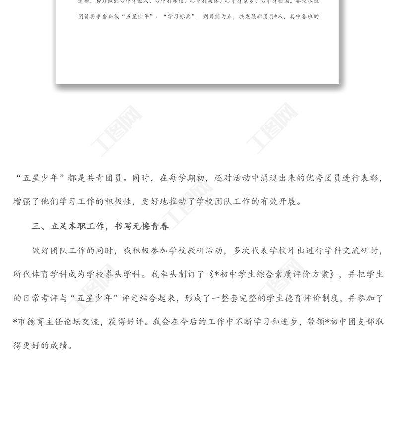 工圖網(wǎng)提供五四青年節(jié)先進(jìn)個(gè)人事跡材料(學(xué)校團(tuán)支部書記)供會(huì)員免費(fèi)下載。更多精彩黨課PPT素材,盡在工圖網(wǎng)。