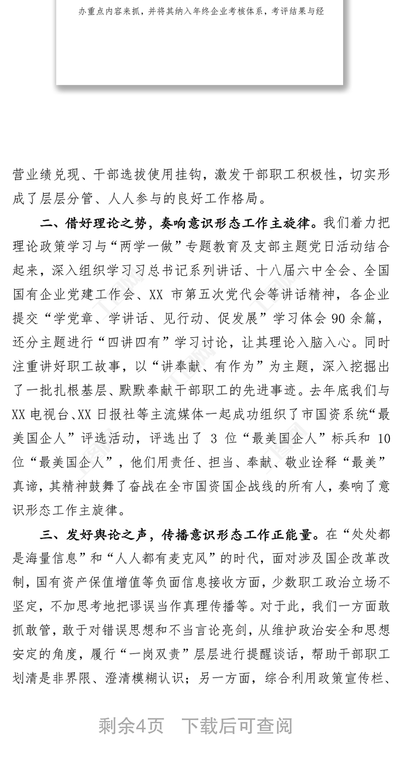 2021年意識(shí)形態(tài)工作學(xué)習(xí)材料2021黨支部書記意識(shí)形態(tài)工作述職報(bào)告2022黨員領(lǐng)導(dǎo)干部網(wǎng)絡(luò)意識(shí)形態(tài)工作教育培訓(xùn)工作方案2021黨委黨組網(wǎng)絡(luò)意識(shí)形態(tài)工作責(zé)任實(shí)施細(xì)則全文專題研究意識(shí)形態(tài)工作會(huì)議記錄2021意識(shí)形態(tài)工作組織生活會(huì)材料2021網(wǎng)絡(luò)意識(shí)形態(tài)工作分析研判報(bào)告2022意識(shí)形態(tài)工作巡察重點(diǎn)及注意事項(xiàng)公安意識(shí)形態(tài)工作計(jì)劃2021統(tǒng)戰(zhàn)部工作意識(shí)形態(tài)發(fā)言中學(xué)2021年意識(shí)形態(tài)工作總結(jié)2021車隊(duì)意識(shí)形態(tài)工作總結(jié)編辦意識(shí)形態(tài)工作整改社區(qū)2021年上半年意識(shí)形態(tài)工作總結(jié)