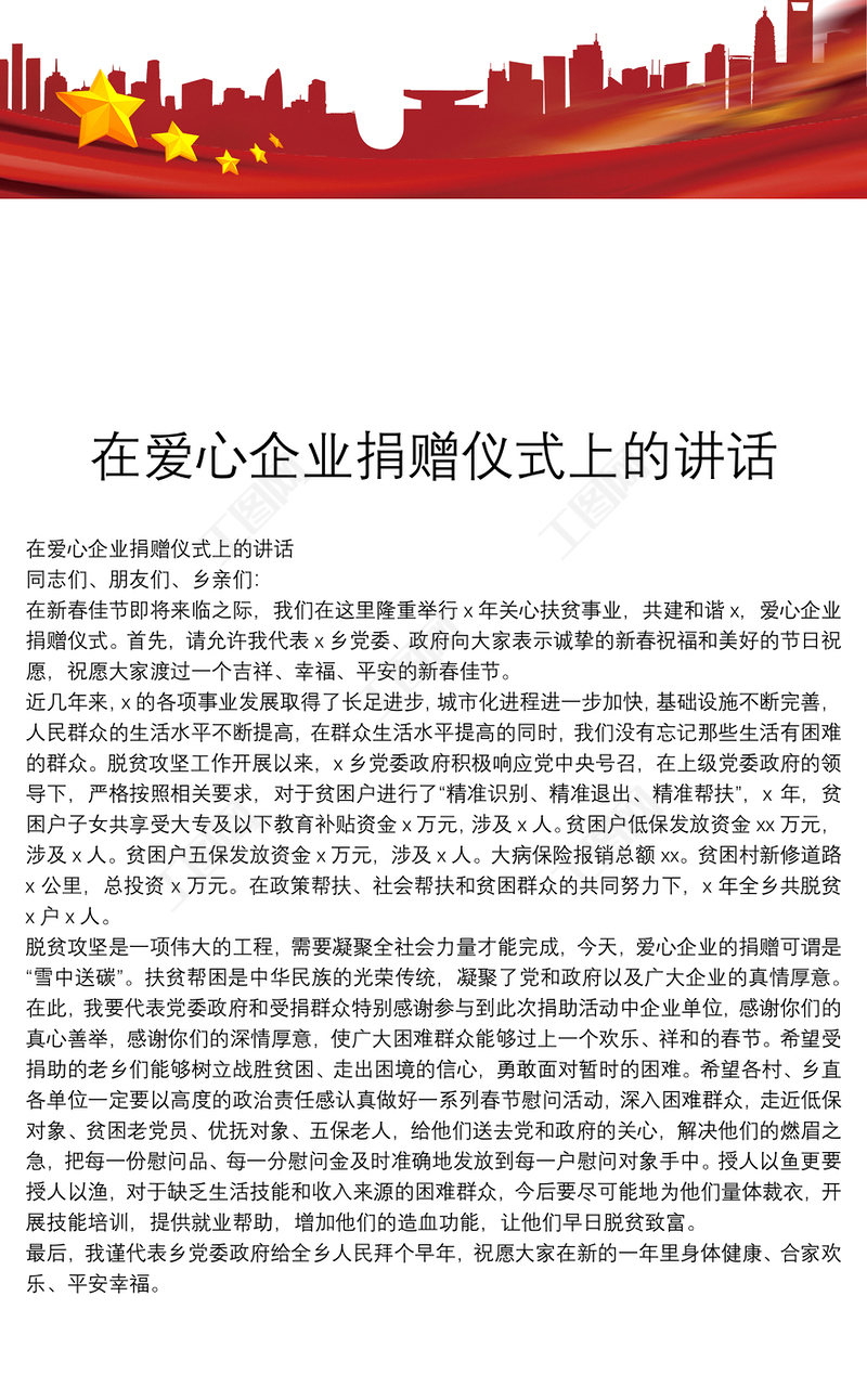 工圖網(wǎng)提供在愛心企業(yè)捐贈儀式上的講話供會員免費(fèi)下載。更多精彩黨課PPT素材,盡在工圖網(wǎng)。
