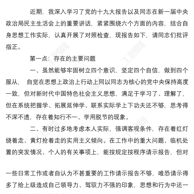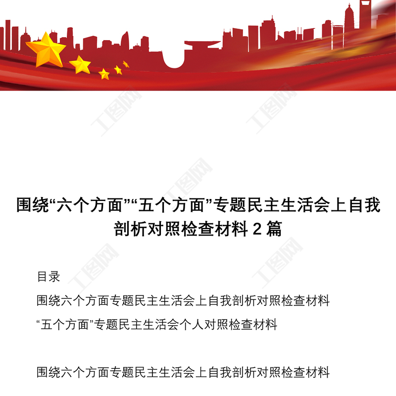工圖網(wǎng)提供圍繞六個方面五個方面專題民主生活會上自我剖析對照檢查材料2篇供會員免費(fèi)下載。更多精彩黨課PPT素材,盡在工圖網(wǎng)。
