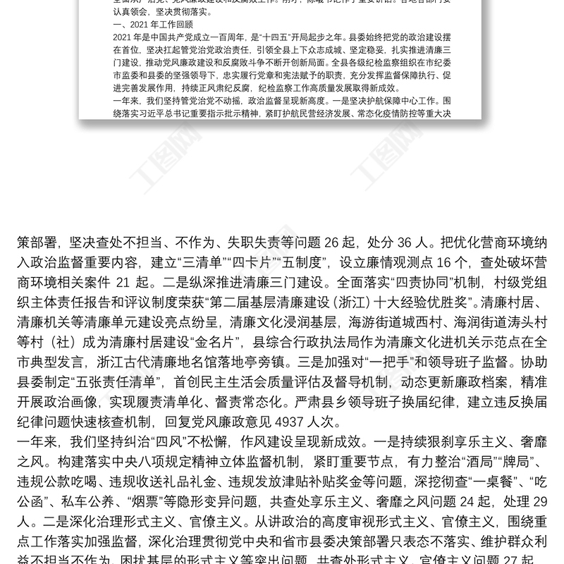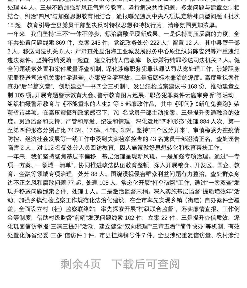 2021五年工作總結(jié)鄉(xiāng)鎮(zhèn)黨代會(huì)紀(jì)委工作報(bào)告范文嚴(yán)格執(zhí)紀(jì)監(jiān)督落實(shí)兩個(gè)責(zé)任不斷將全鎮(zhèn)黨風(fēng)廉政建設(shè)和反腐敗工作推向深入工作匯報(bào)包含