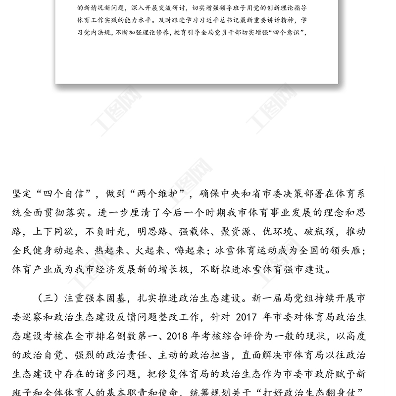工圖網(wǎng)提供體育局關(guān)于2019年度推進(jìn)政治生態(tài)建設(shè)情況報告(市級局)供會員免費下載。更多精彩黨課PPT素材,盡在工圖網(wǎng)。