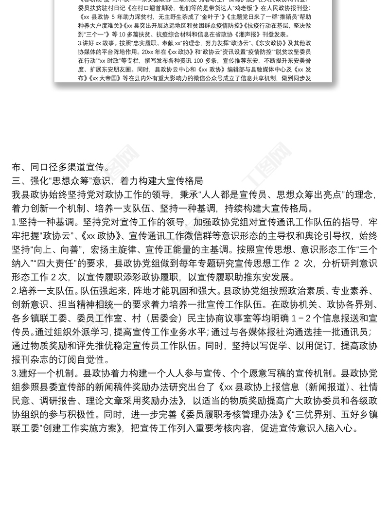 工圖網(wǎng)提供縣政協(xié)宣傳工作經(jīng)驗交流材料供會員免費下載。更多精彩黨課PPT素材,盡在工圖網(wǎng)。