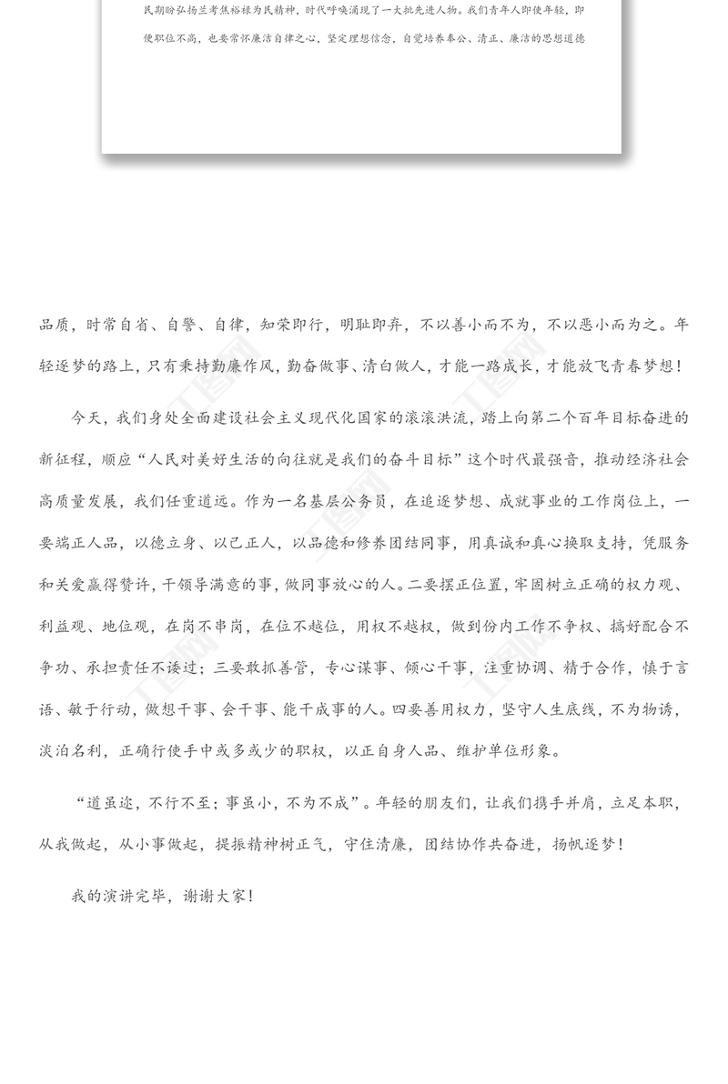 首頁 > WORD文檔 > 公文范文 > 廉潔自律、擔當作為主題演講稿:青春逐夢,廉潔同行.DOCX 【圖片、文字、動畫均可編輯】
