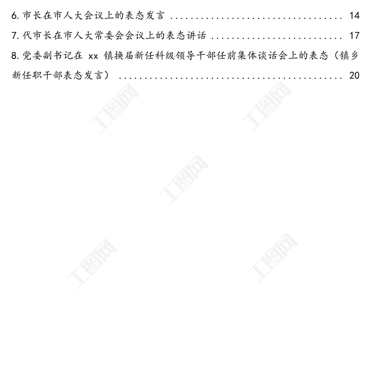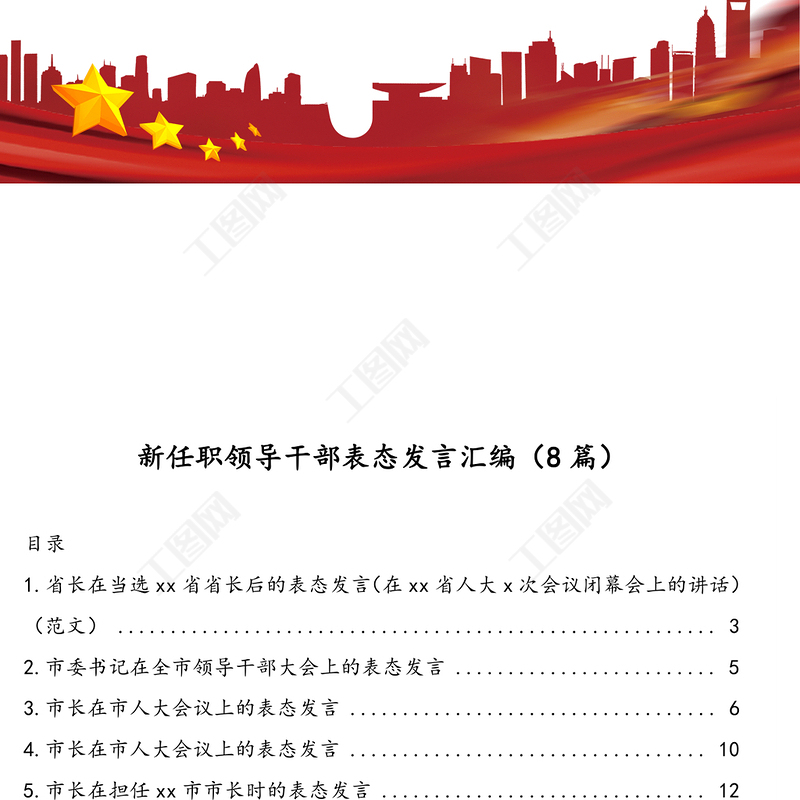 工圖網(wǎng)提供新任職領(lǐng)導(dǎo)干部表態(tài)發(fā)言匯編(8篇)供會(huì)員免費(fèi)下載。更多精彩黨課PPT素材,盡在工圖網(wǎng)。