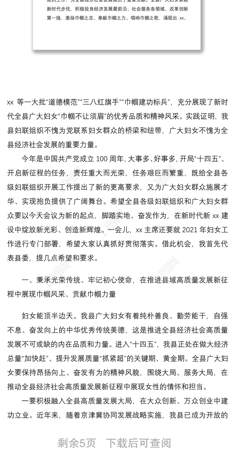 在慶祝2021年“三八”婦女節(jié)暨全縣婦女工作會議上的講話范文(縣級)