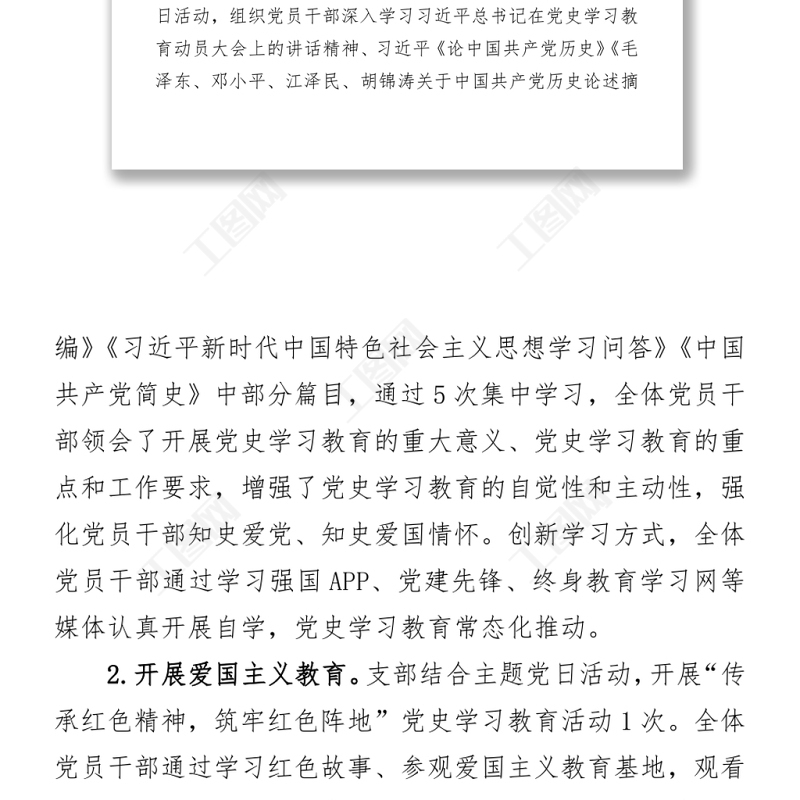 工圖網(wǎng)提供2021黨支部黨史學習教育推進情況總結(jié)報告供會員免費下載。更多精彩黨課PPT素材,盡在工圖網(wǎng)。