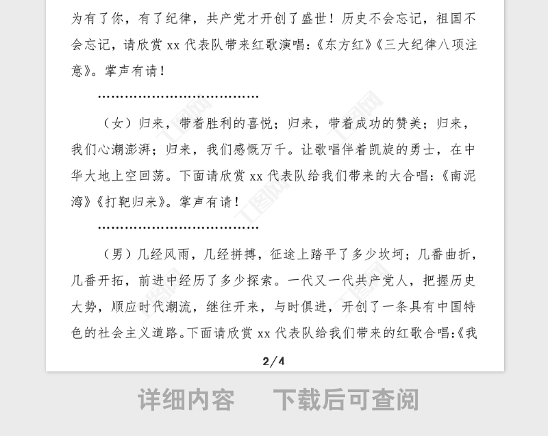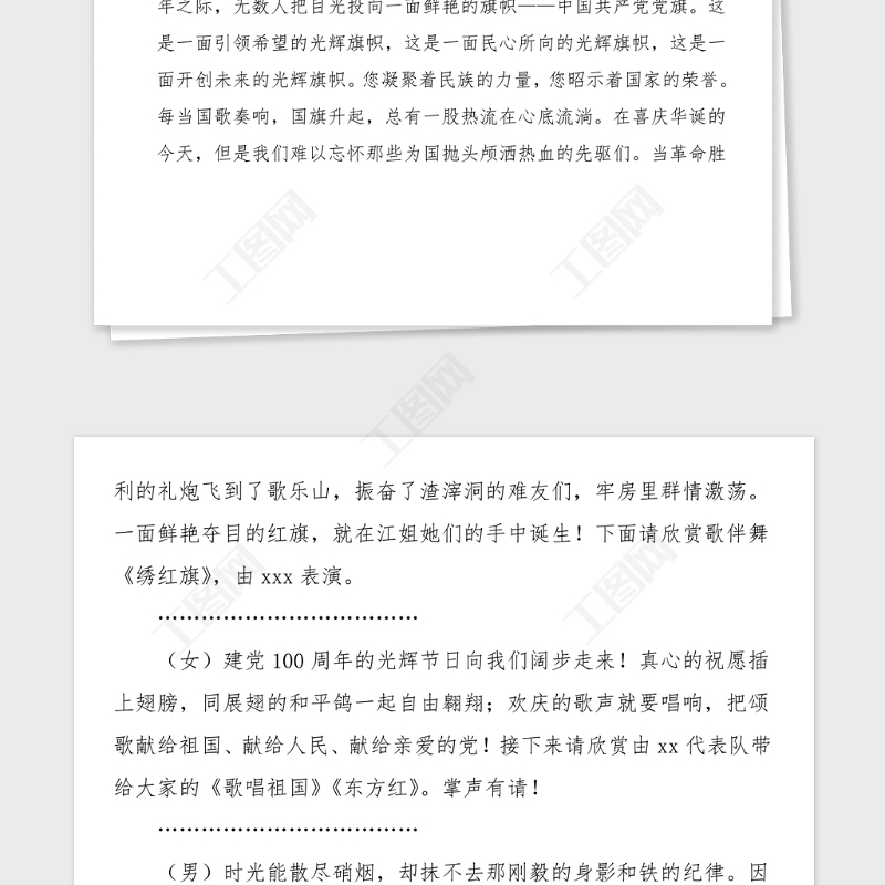 工圖網(wǎng)提供主持詞100周年文藝聯(lián)歡會主持人串詞范文文藝晚會主持詞七一建黨節(jié)供會員免費下載。更多精彩黨課PPT素材,盡在工圖網(wǎng)。